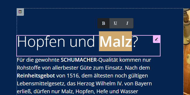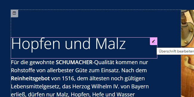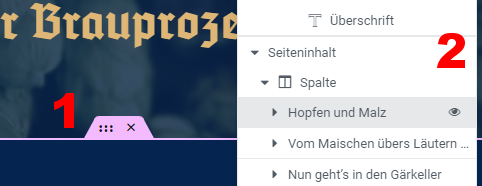 Mit dem Mauszeiger in der Seiten-Ansicht das zu bearbeitende Element suchen und anklicken oder mit dem Mauszeiger darüber fahren und das Icon mit dem Stift "[Element] bearbeiten" klicken. |