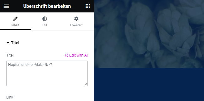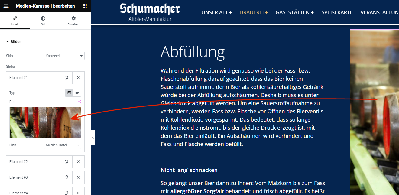 Beim Klicken auf ein Element ändert sich die linke Seitenleiste und stellt Einstellungen für das ausgewählte Element dar. Je nach Element sind die Optionen dort unterschiedlich. Meist reichen Änderungen im Tab "Inhalt", um z. B. Bilder in einem Karussell auszutauschen oder Links von Buttons zu bearbeiten. |
