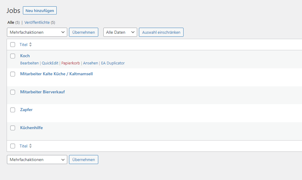Im Admin Backend das Seitenleisten-Menü "Jobs" klicken oder den Mauszeiger darauf bewegen und im ausgeklappten Untermenü "Alle Jobs" klicken.