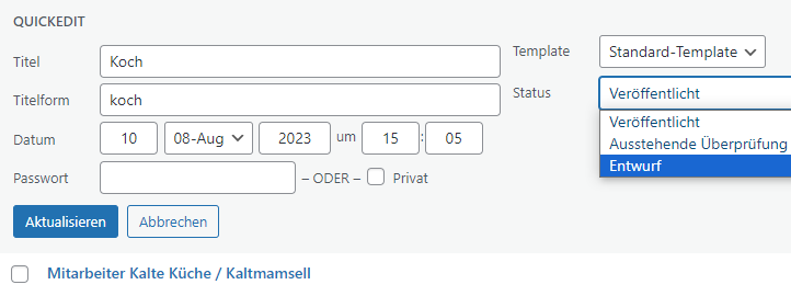 Dort bei "Status" im Dropdown-Menü "Entwurf" auswählen und anschließend auf "Aktualisieren" klicken.